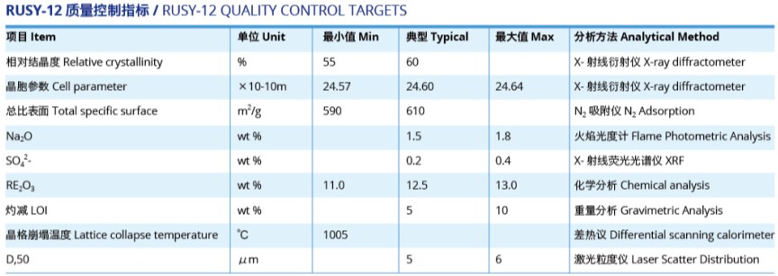 RUSY-12稀土Y分子筛,含RE2O3混合氧化稀土≥12%,根据用户需要,可以调节稀土中La2O3和CeO2的比例。
